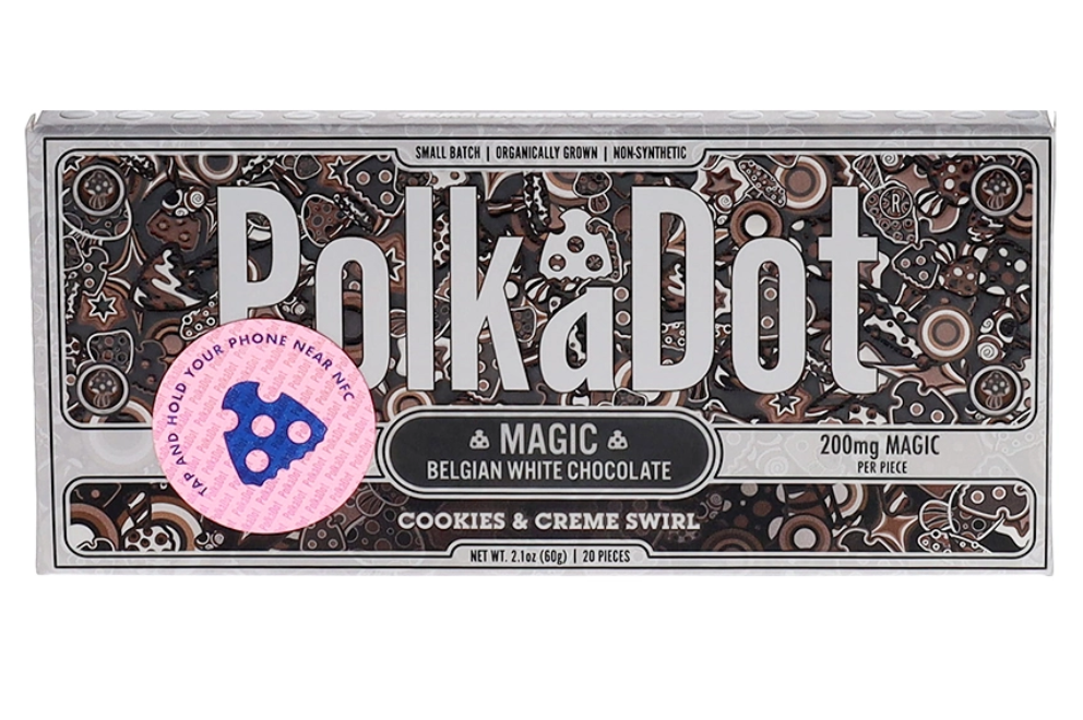Discover a unique blend of sweetness and enchantment with Cookies & Creme Swirl PolkaDot Magic Mushroom Belgian White Chocolate. Each piece combines smooth white chocolate with crunchy cookie bits and a touch of magic mushrooms for a truly special treat. Infused with 200mg of magic mushrooms per piece, it offers a spectrum of experiences: